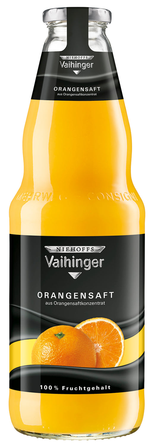 Orangensaft aus Orangensaftkonzentrat, ohne Zuckerzusatz, Fruchtgehalt 100%.